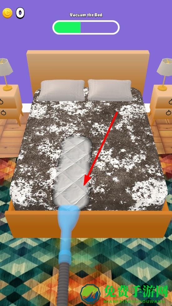 2、切换至特写视角,根据提示,操作吸尘器、扫帚等清洁工具,清洁床铺时来回拖动吸走灰尘,整理沙发需扫净缝隙杂物。