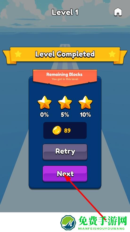 3、冲过终点后,剩余方块数字越高、收集金币越多,结算时的奖励就越丰厚;点击Next按钮进入下一关,迎接更复杂的关卡挑战。