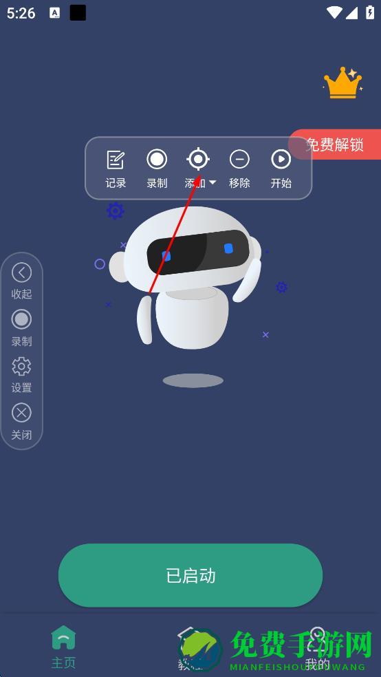 2、在APP主界面,点击启动按钮,进入自动化操作设置页面,可看到记录、录制、添加等功能选项。