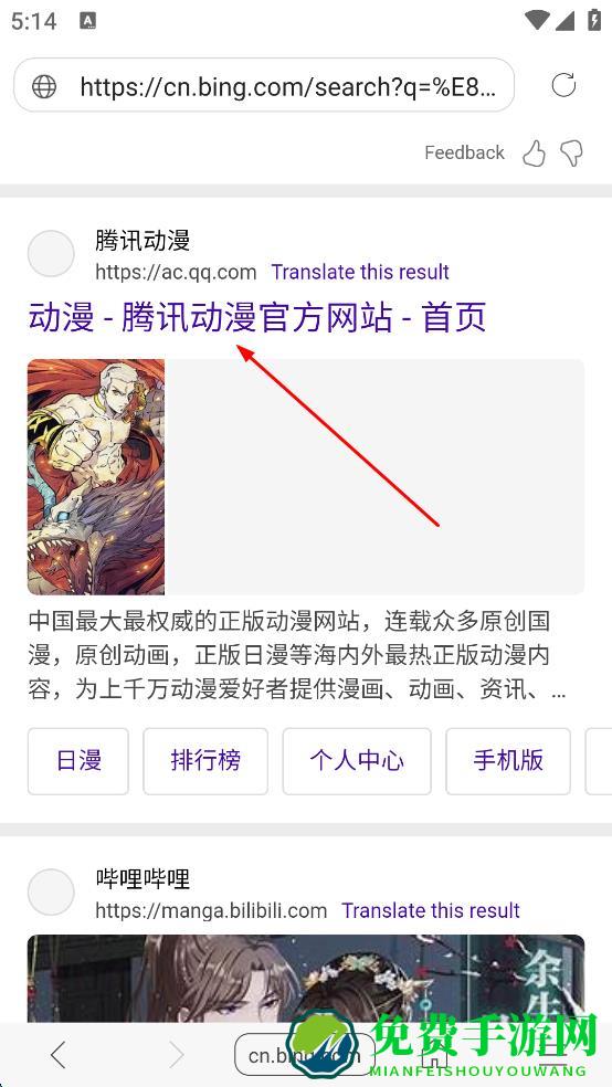 3、搜索完成后,在搜索结果页面,找到像腾讯动漫官方网站这样的动漫平台链接,点击该链接,进入对应的动漫平台页面。