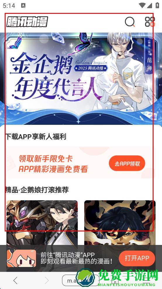 4、进入动漫平台页面后,可查看平台内的各类动漫相关内容,比如推荐的漫画、活动信息等,还能根据提示下载APP,享受更多服务。