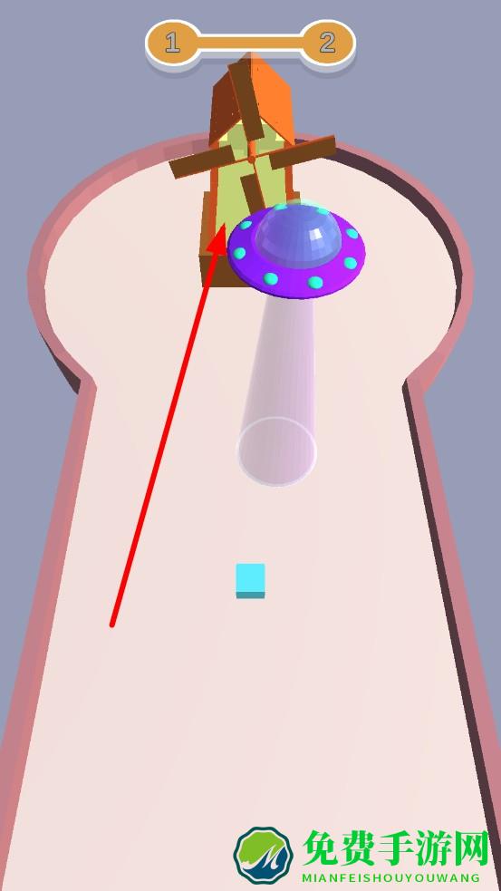 2、攒够资源后,驾驶飞碟抵达终点区,吸取风车的方块,将所有散落的方块都吸取,顺利进入下一关。