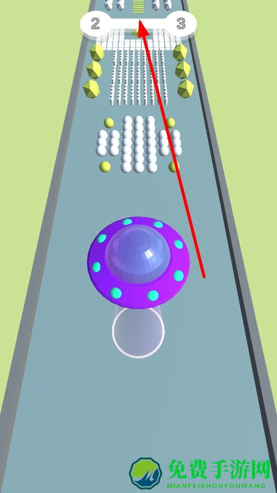 1、进入关卡,滑动屏幕操控飞碟移动,对准管道入口,收集路径上的白色方块,避开蓝色的过大方块障碍,上方进度条随收集推进。