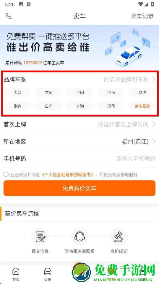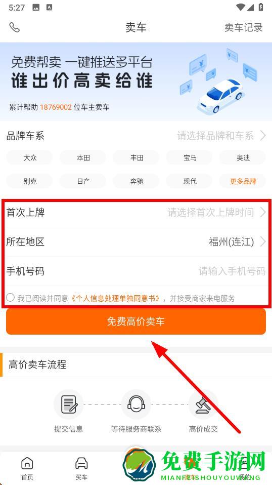 4、接着依次填写首次上牌时间、所在地区、手机号码,勾选同意个人信息处理单独同意书,点击免费高价卖车按钮,即可发布卖车信息。