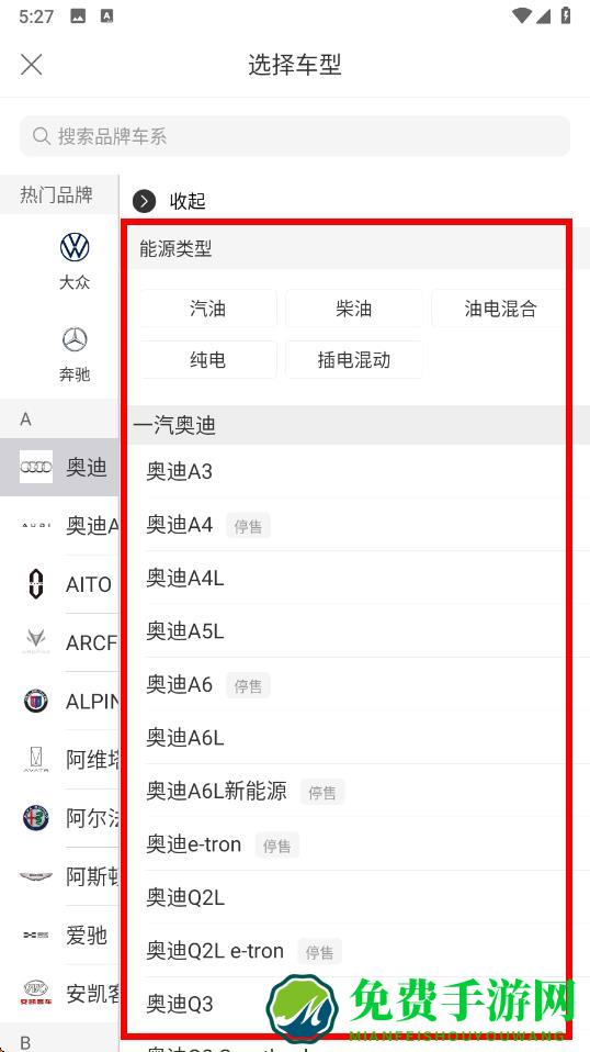 3、选择好品牌车系后,进一步选择车辆的具体车型以及能源类型。
