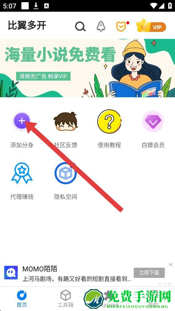 1、打开比翼多开APP,在首页点击添加分身按钮。