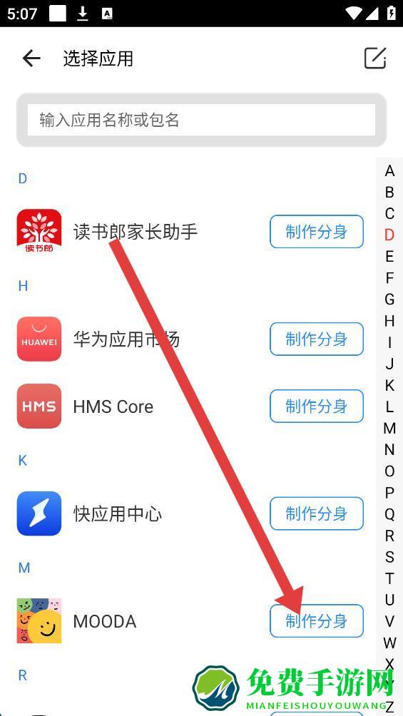 2、进入选择应用界面,选择需要制作分身的应用并点击分身按钮。