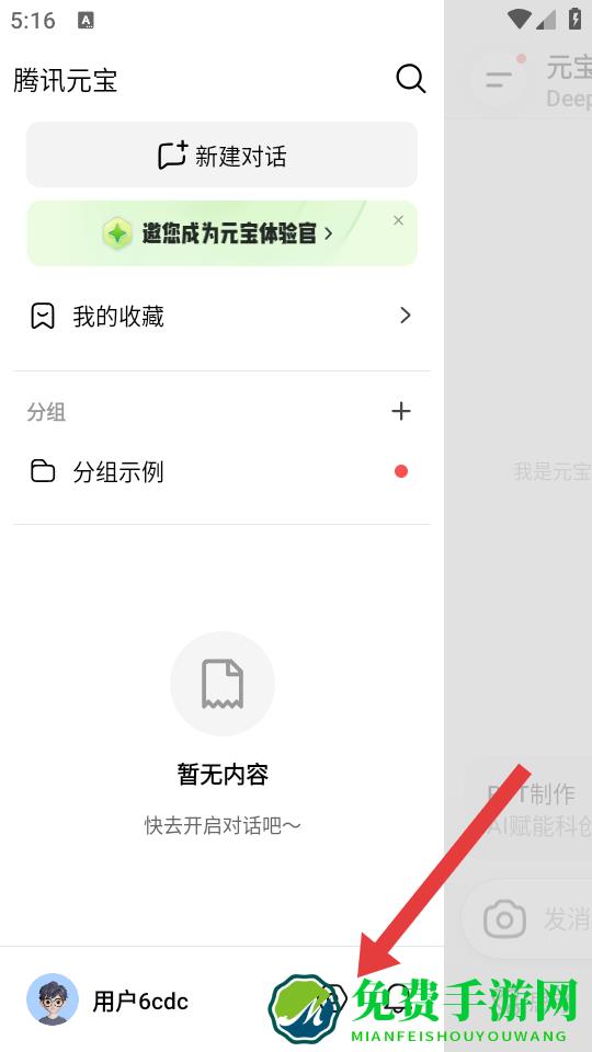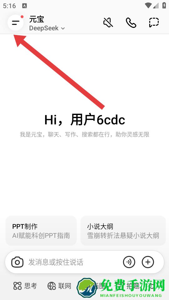 1、打开腾讯元宝APP,点击界面左上角的菜单按钮,展开侧边栏。