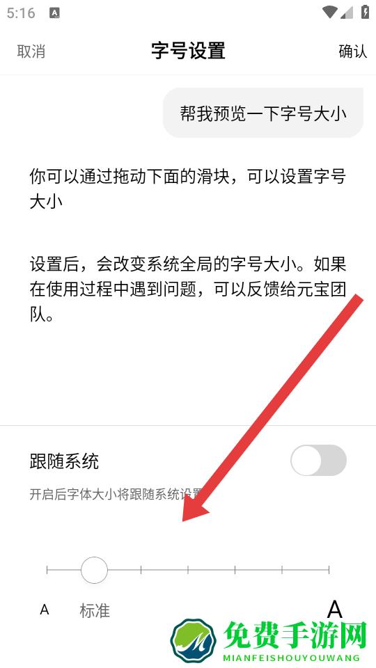 4、在字号设置页面,拖动滑块调整大小,调整后点击确认即可完成设置。