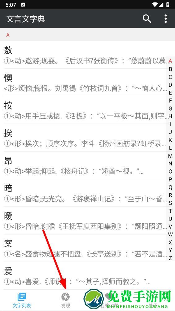 1、打开文言文字典app,点击底部导航栏中的发现选项,进入发现页面。