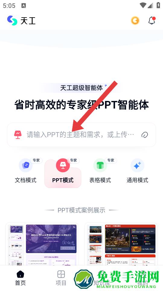 1、进入天工首页PPT模式,可以在输入框中输入PPT的主题和需求。