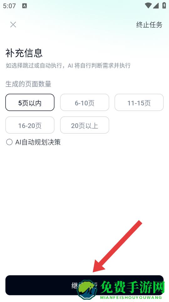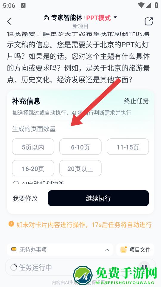 4、在补充内容界面,选择好页数后点击继续执行,即可启动PPT生成流程。