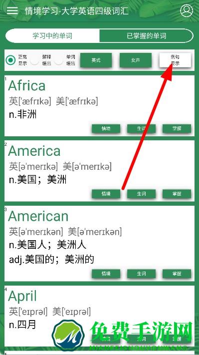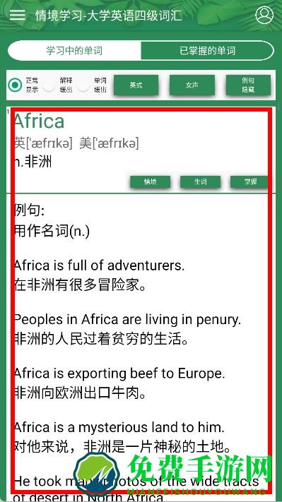 3、在情境学习页面点击例句显示,可查看单词的例句。