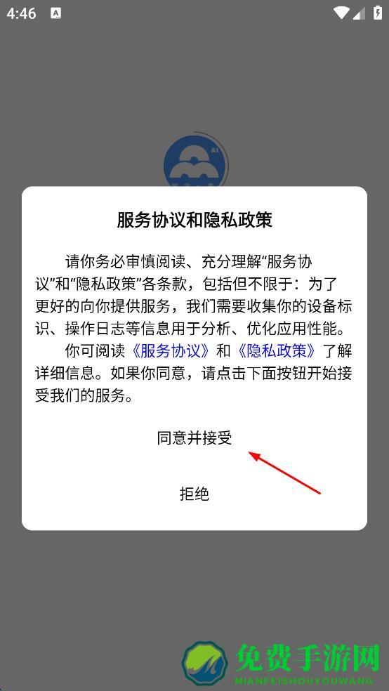 1、打开智云e票APP,会弹出服务协议和隐私政策提示框,仔细阅读相关内容后,点击“同意并接受”按钮,进入APP登录界面。