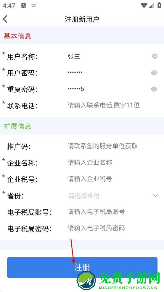 4、基本信息和扩展信息都填写完毕后,点击“注册”按钮,即可完成智云e票APP的注册操作。