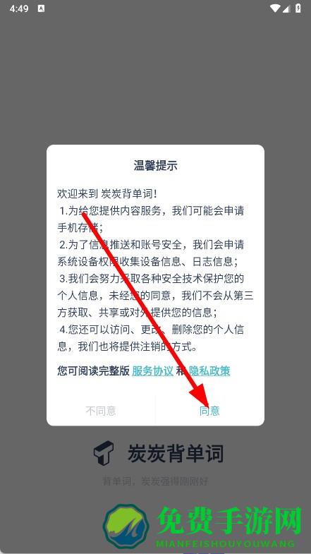 1、打开炭炭背单词,在弹窗中点击同意。