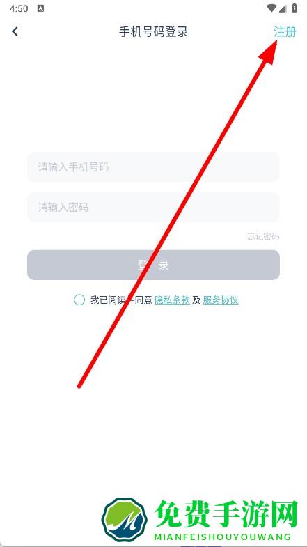 3、在手机号码登录页面,点击右上角注册。