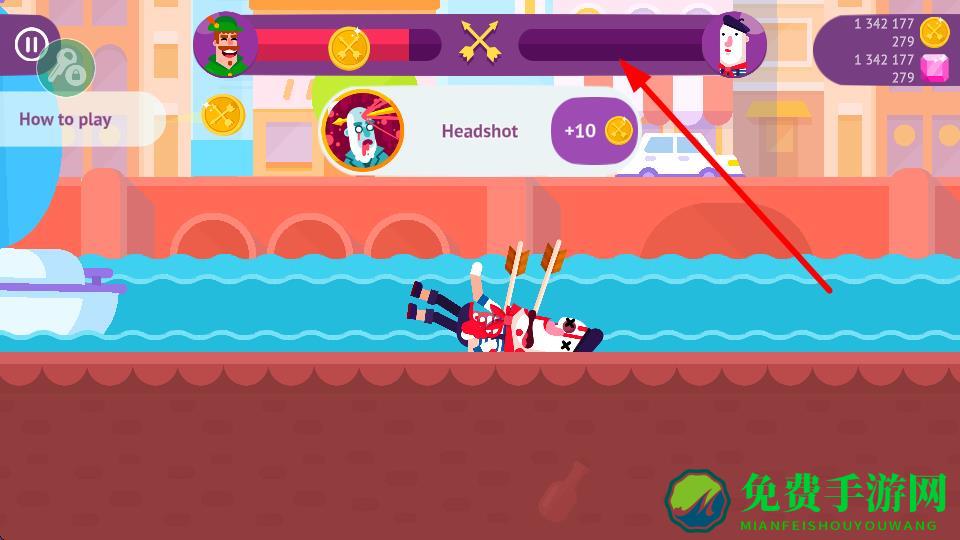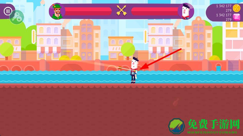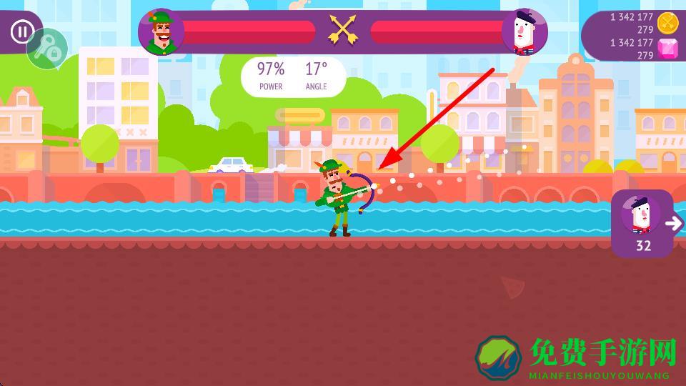 2、战斗时,操控角色调整弓箭的力度和角度,按照箭头指引发射弓箭,攻击对手,精准把控力度角度提高命中。
