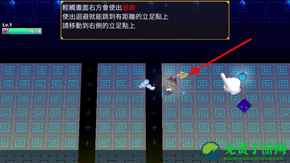 2、在游戏场景中,轻触画面右方可使出回避技能,使用该技能能跳到有距离的立足点上,按照提示移动右侧。