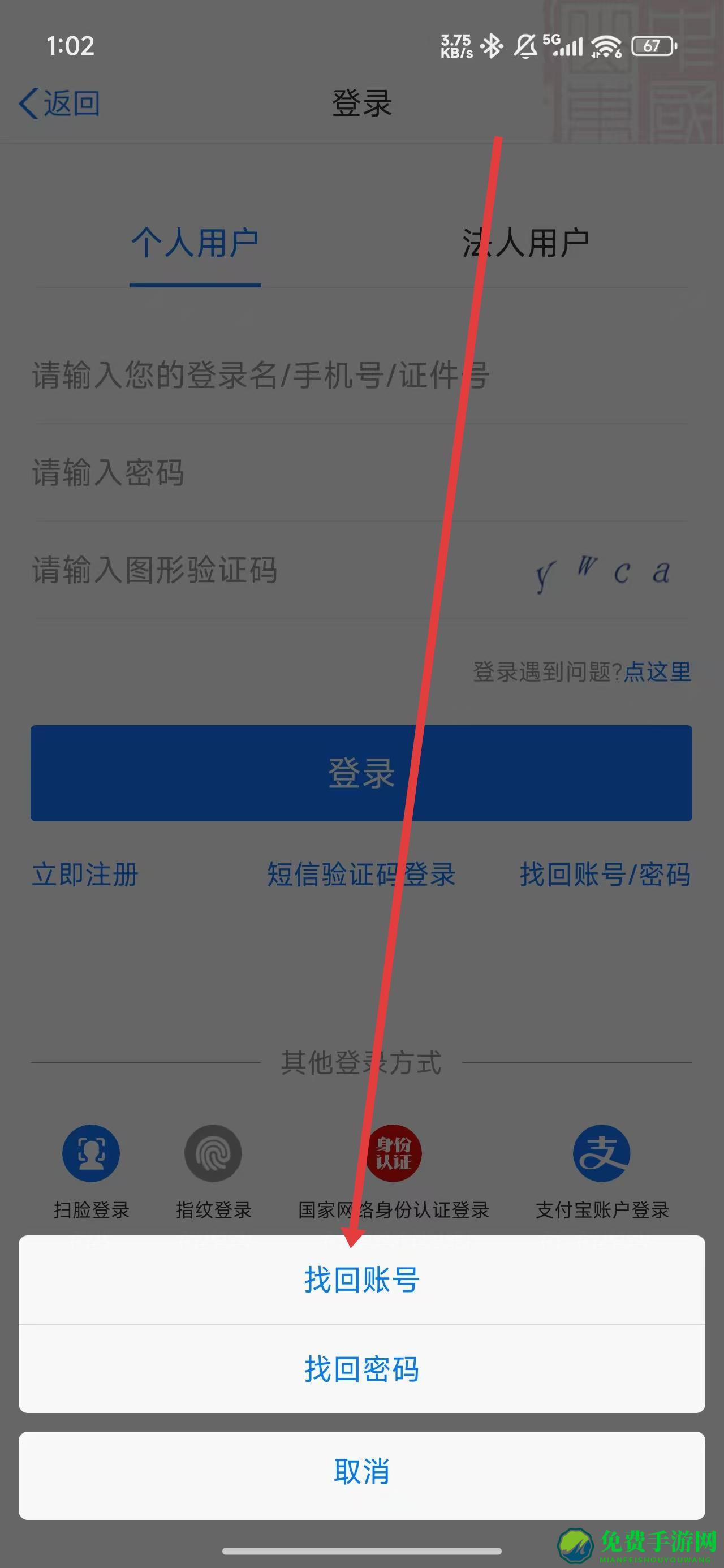 2、在弹窗弹出来的选择中,记得点可以提高点击选择找回账号选项。