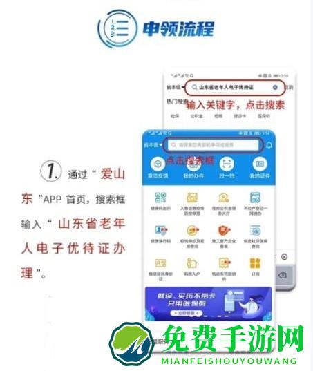 2.接着在“爱山东”App首页,点击搜索框,输入“山东省老年人电子优待证办理”,找到该服务并进入申领流程。