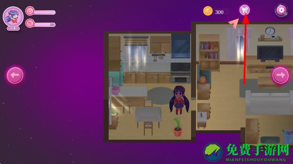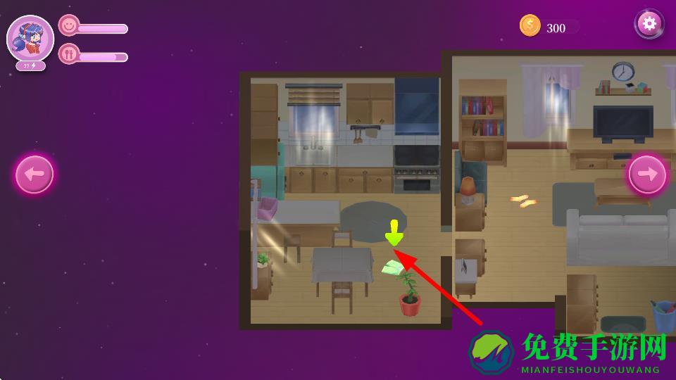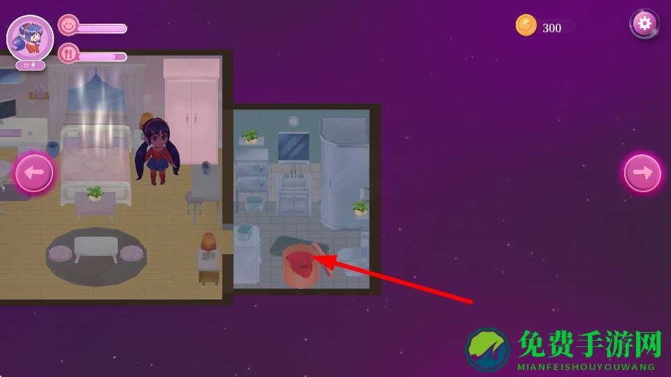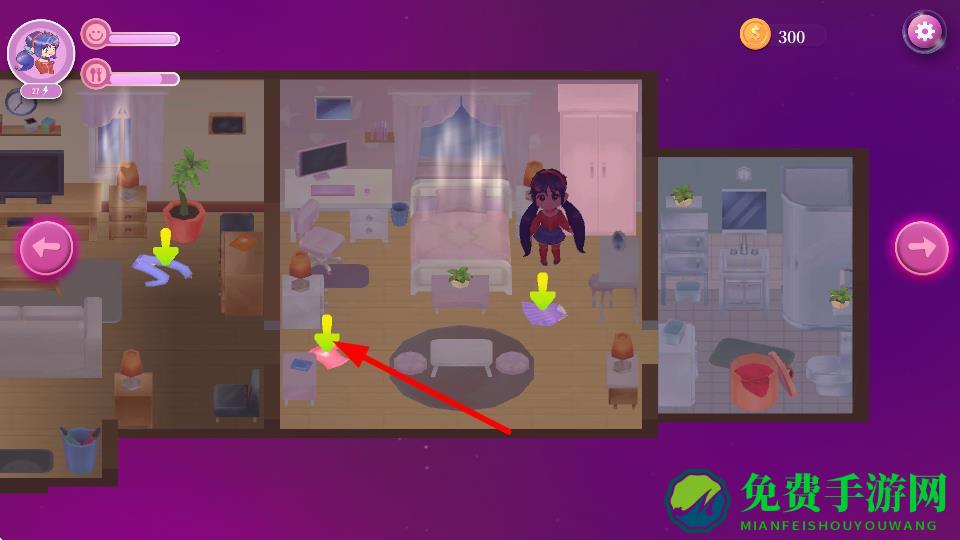 1、在房间场景中,点击箭头指向的粉色物品区域,物品进行整理或清洁操作,提升房间整洁度。