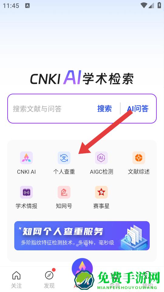 1、打开手机知网APP,进入AI检索页面,点击个人查重选项,这是进入查重服务的关键入口,确保准确找到对应功能。