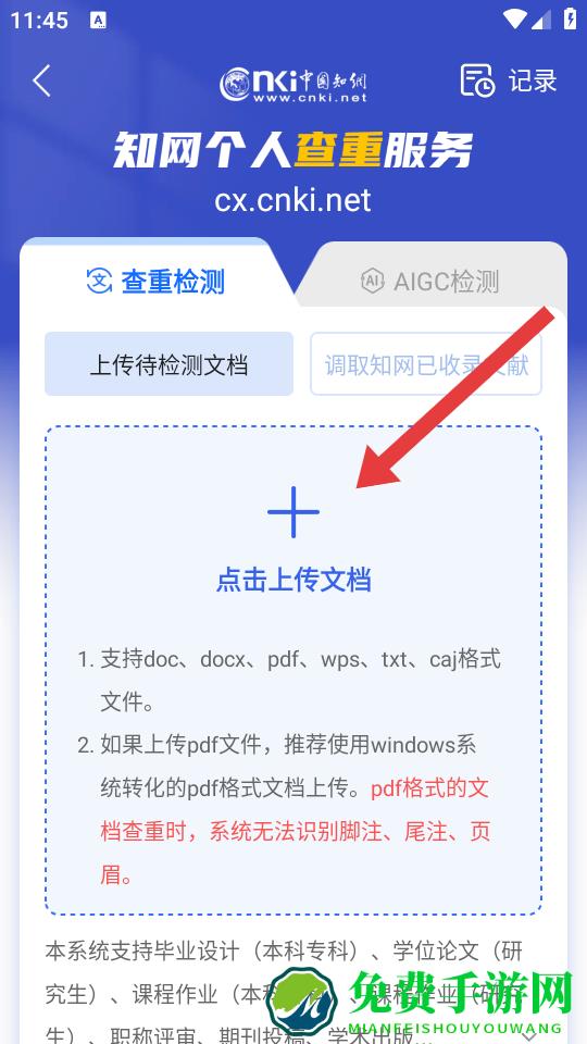 2、在知网个人查重服务页面,点击上传文档区域,选择待检测的文档,按照提示完成文件上传操作。