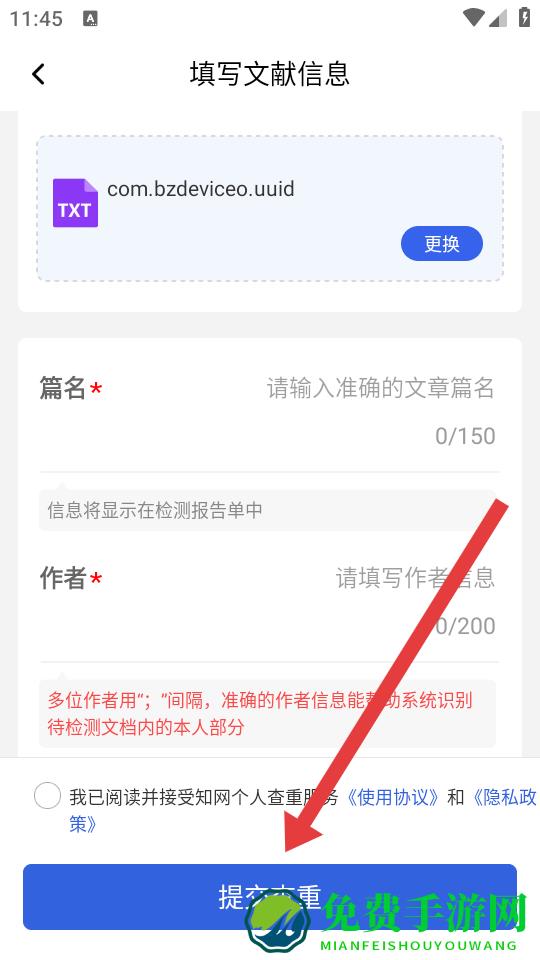 3、填写文献信息,包括篇名、作者等必填项,勾选接受使用协议和隐私政策后,点击提交查重按钮,完成查重申请。