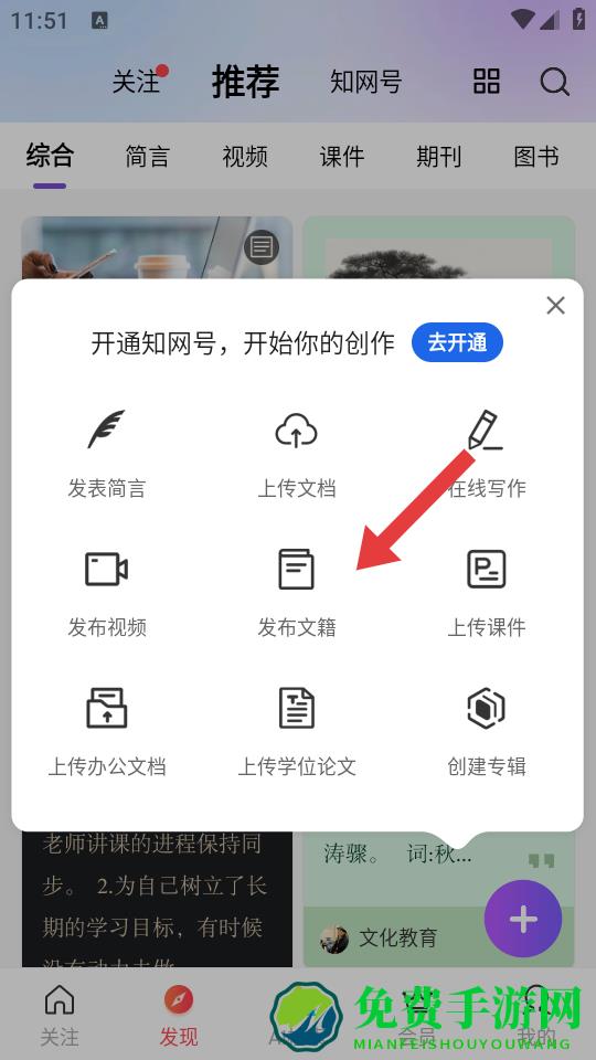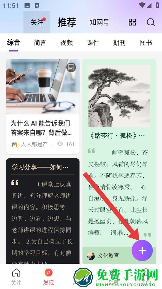 1、打开手机知网APP,进入发现页面,点击右下角紫色+按钮,弹出创作功能菜单。