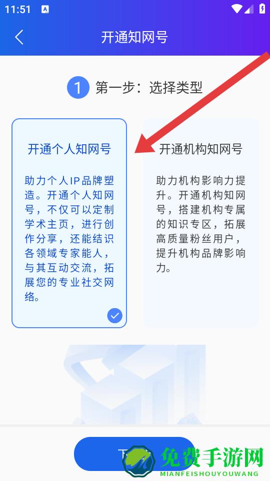 3、在投稿前需要先开通知网号,选择开通个人知网号,点击下一步完成账号开通,以便后续投稿的操作。
