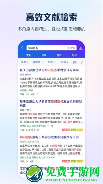 手机知网app是由中国学术期刊光盘版电子杂志社有限公司专为安卓用户开发的期刊阅读应用,当前版本已正式上线,且支持任意期刊免费阅读,对追求知识与信息的用户而言,这款平台无疑是宝贵助手,能助力大家在知识海洋中畅游,进一步实现自我提升与成长,有相关需求的朋友,赶紧前往免费手游网下载使用吧。