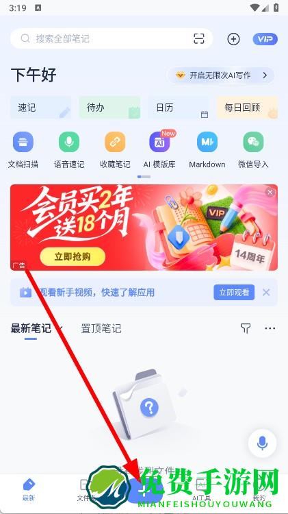 1、打开APP,进入首页后,点击底部中间的+按钮,开始创建新笔记。
