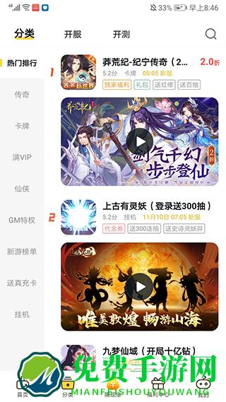3、进入【分类】界面,包括传奇、卡牌、满VIP、仙侠、GM特权、开服、开测等丰富的游戏分类,玩家可以自行选择搜索感兴趣的游戏,我们以【上古有灵妖】为例,