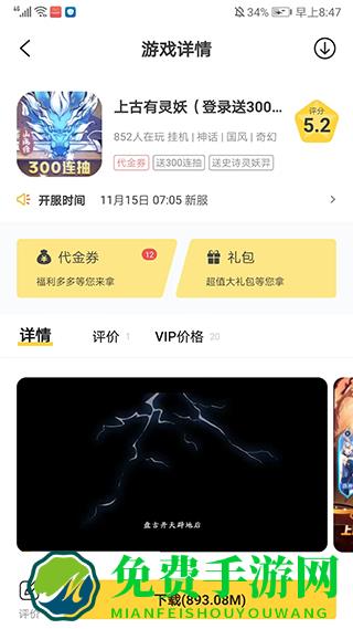 4、进入游戏详情界面,滑动屏幕我们可以了解游戏的介绍、评价、开服时间等信息,也可以领取代金券、礼包等福利,最后只需点击下载安装就可以体验了,