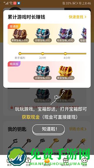 5、进入【赚现金】界面,我们可以通过玩游戏累计时长来获取宝箱,打开宝箱后可以获得现金奖励,