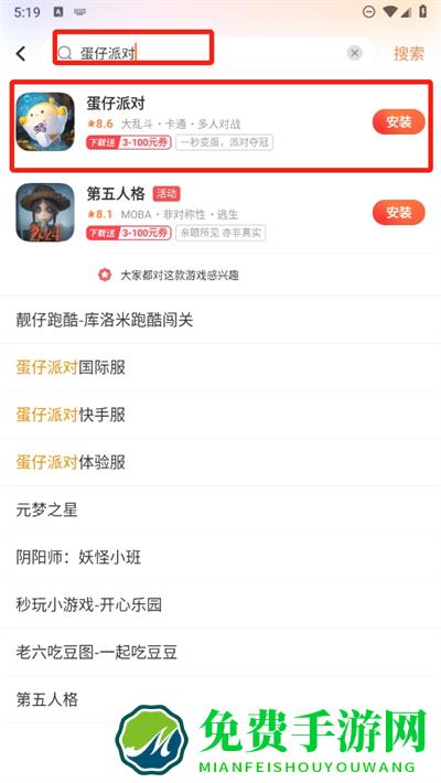 2、我们以蛋仔派对游戏为例,输入后将会弹出该游戏的相关内容,可直接安装或点击进入;