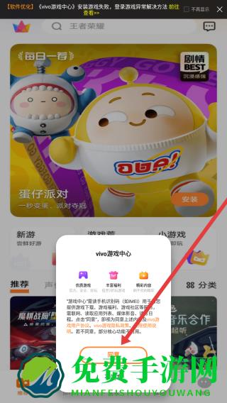 1、打开vivo游戏中心,弹出用户协议及隐私政策提示弹窗,点击橙色同意按钮,进入应用开始浏览游戏。