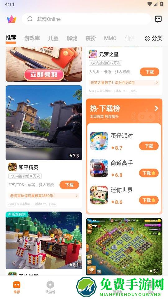 2、来到软件首页,有给大家提供超多的游戏资源,用户也可以直接点击上方的搜索栏,如下图所示,输入游戏名称,快速搜索;