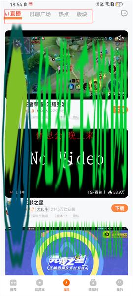 4、点击发现栏目,可以看看上分为直播、群聊广场、热点、板块四个栏目,用户可以在这里观看自己喜欢的游戏直播,游戏热点等,还能在群聊广场中和广大网友进行交流讨论,一起进入房间畅聊;