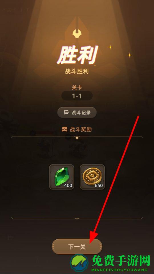 3、玩家然后在战斗胜利后,获取胜利奖励,点击下一关,继续挑战新的敌人与场景,不断探索游戏内容。