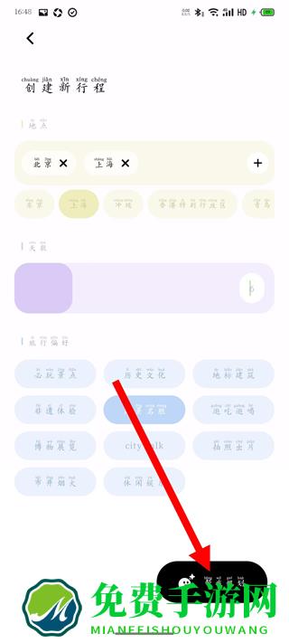 3、在创建新行程页面,设置好地点、天数、行程偏好等信息后,点击帮我规划。
