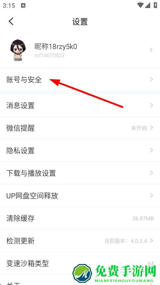 3、然后进入设置界面,在这里找到【账号与安全】功能选项并点击;