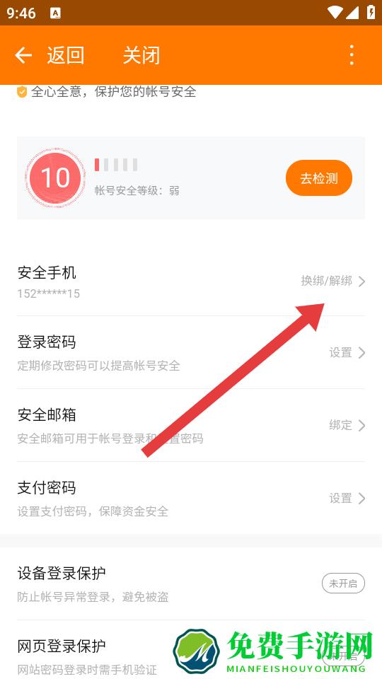 4、在安全设置界面里,找到安全手机选项,点击换绑/解绑,按照后续提示完成手机号解绑操作。