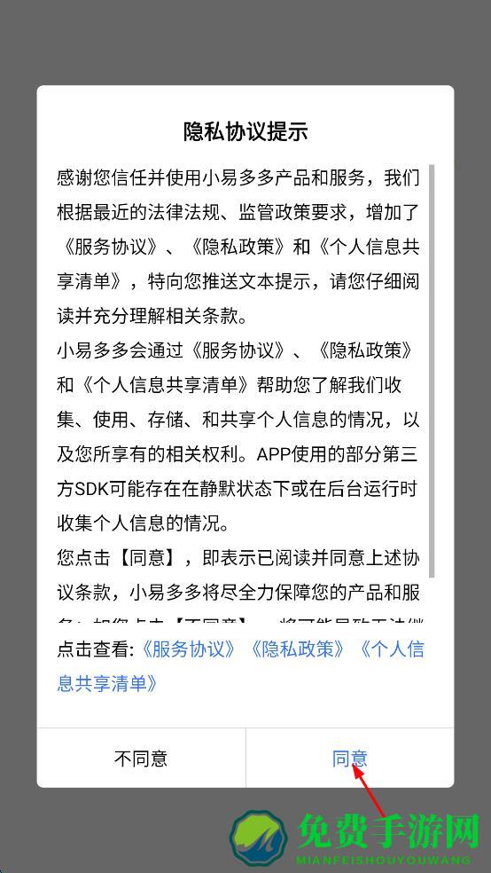 1、打开小易多多APP,在弹出的隐私协议提示页面,仔细阅读相关条款后,点击同意按钮。