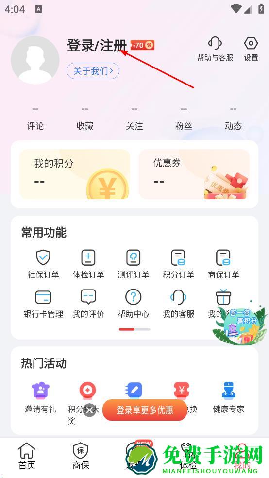 3、在个人页面,点击上方登录/注册按钮,进入用户登录界面。