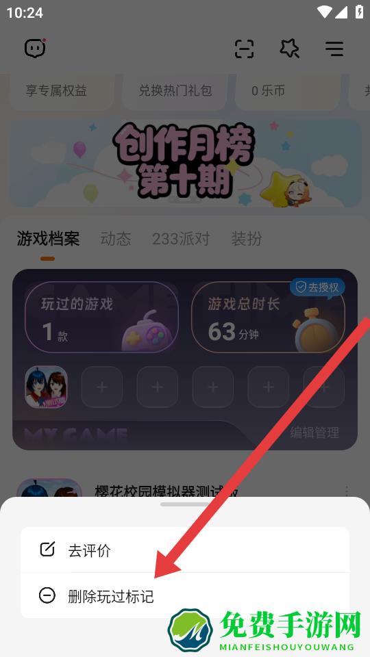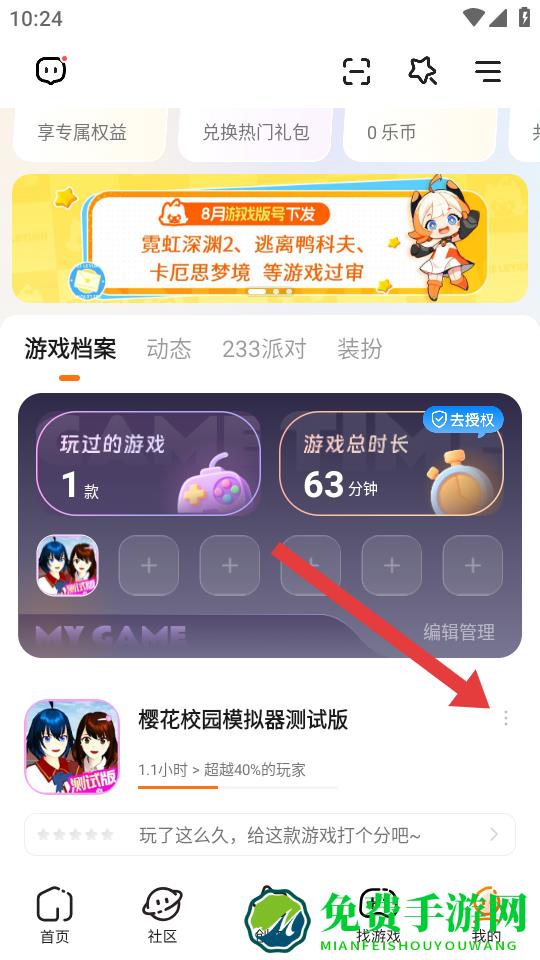 1、进入233乐园我的页面,在游戏档案列表中找到要删除记录的游戏,点击该游戏右侧的菜单按钮。