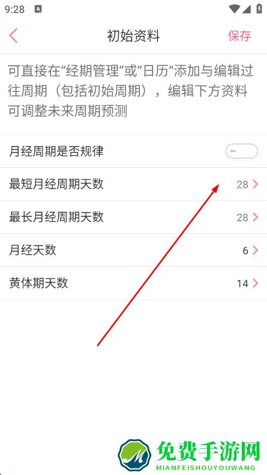 3、进入初始资料页面后,点击最短月经周期天数编辑项。