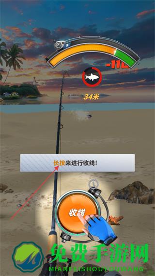 2、当出现长按来进行收线!提示后,点击并长按收线按钮,开始收钓鱼线。