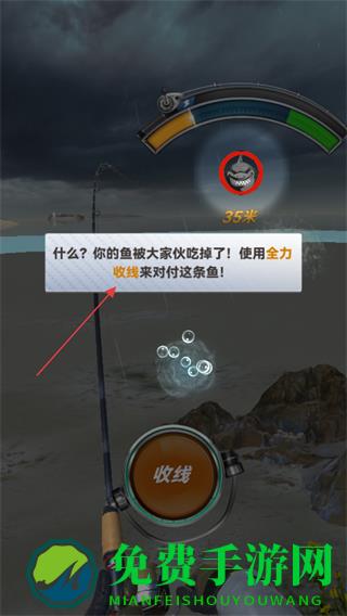 4、遇到提示什么?你的鱼被大家伙吃掉了!使用全力收线来对付这条鱼!时,加大力度长按收线按钮,直至成功钓到鱼。